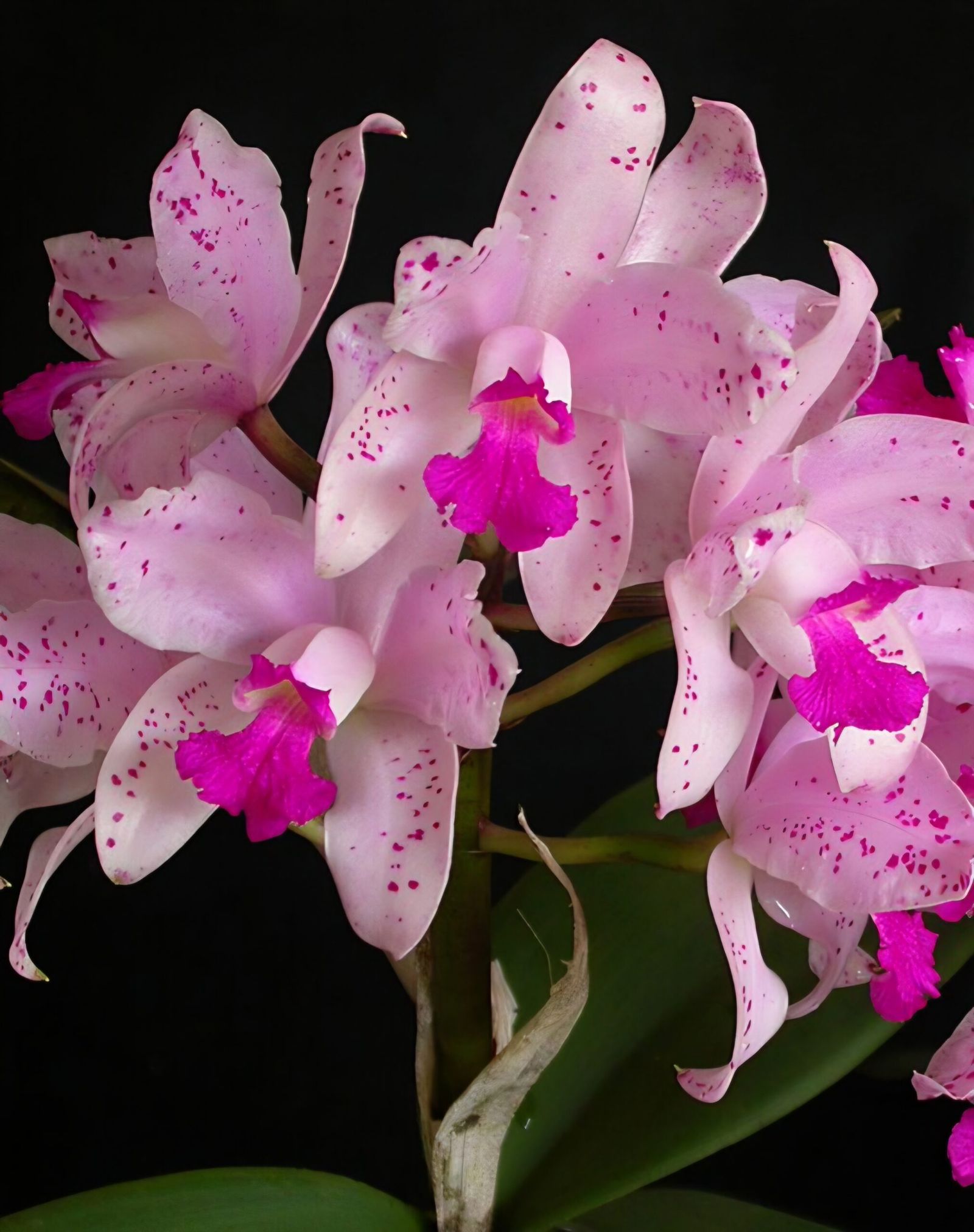 Flores Pintalgadas e Vibrantes: 🎨 As flores apresentam uma textura cerosa e pétalas que variam entre o branco-rosado e o rosa-pálido, sempre adornadas com inúmeras pintas púrpura. No entanto, o seu nome deriva do labelo, que exibe uma cor ametista profunda e intensa.