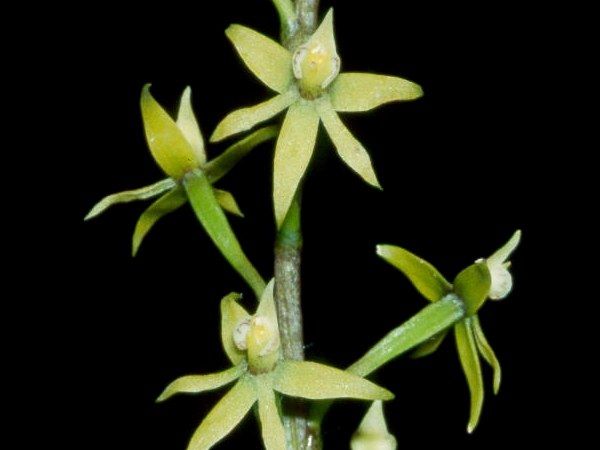 Flores Delicadas e Numerosas: 🌸 Produz pequenas flores (cerca de 1,5 a 2 cm) em hastes florais que podem carregar múltiplas flores simultaneamente. As pétalas e sépalas costumam ter tons de amarelo-esverdeado ou creme, enquanto o labelo branco se destaca com veias ou manchas púrpuras/avermelhadas.
