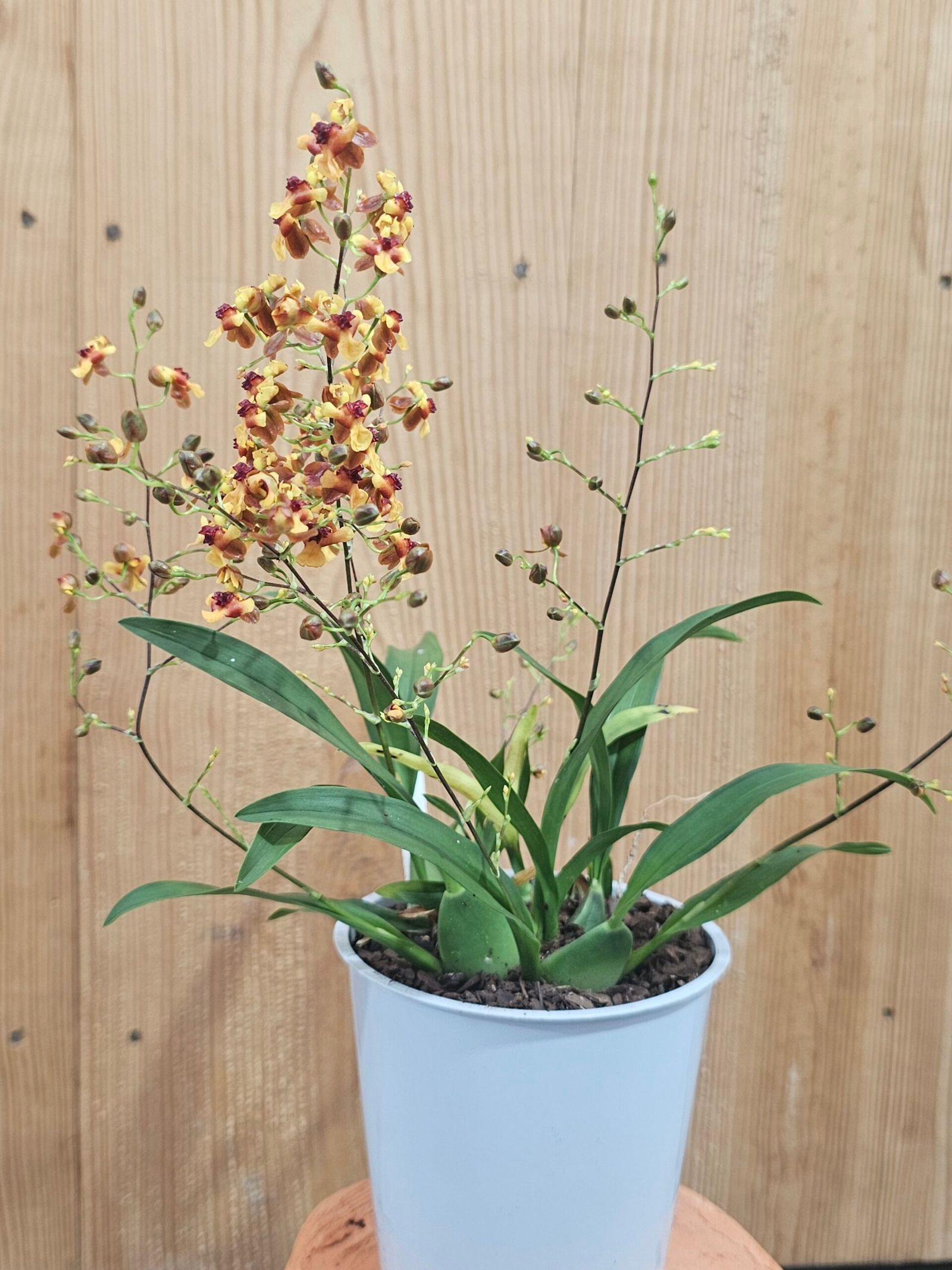 El Oncidium Tiny Twinkle ‘Anna’ es una variedad especial de esta adorable orquídea, conocida por sus pequeñas y encantadoras flores. Sus inflorescencias muestran una profusión de flores en tonos suaves, creando un espectáculo visual encantador. Cada flor tiene una forma delicada, que recuerda a pequeñas estrellas, aportando un toque único a la planta.