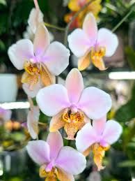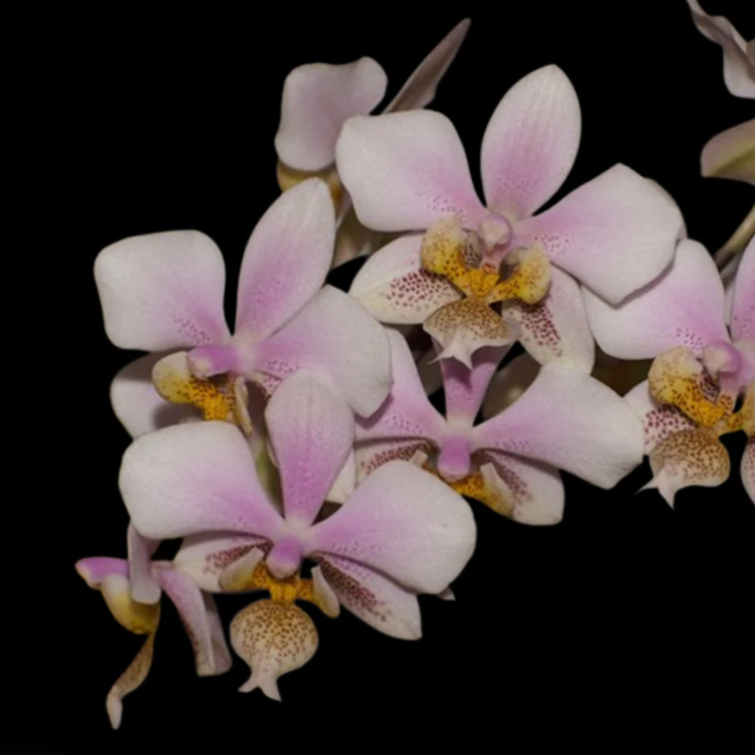 Flores Delicadas e Numerosas: 🌸 As flores surgem em hastes frequentemente ramificadas, criando uma nuvem de flores. Geralmente, exibem tons de branco ou rosa pálido, com o labelo e a base das sépalas finamente pontilhados de castanho ou púrpura, uma característica marcante da Phal. stuartiana.
