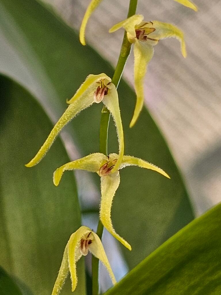 - Flores Minúsculas e Numerosas: A Pleurothallis obovata produz flores muito pequenas, mas em grande número. As flores surgem ao longo da folha, em cachos curtos, e geralmente são de cor verde-amarelada ou creme.