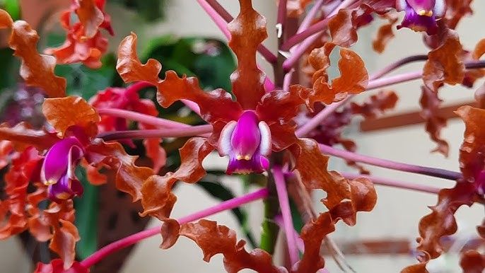 Flores de Pétalas Onduladas: 🌀 A característica mais fascinante desta espécie reside nas suas pétalas e sépalas intensamente encaracoladas. Geralmente, as flores apresentam tons de bronze, castanho-acastanhado e púrpura, o que confere um aspeto selvagem e sofisticado à planta.